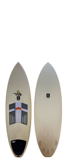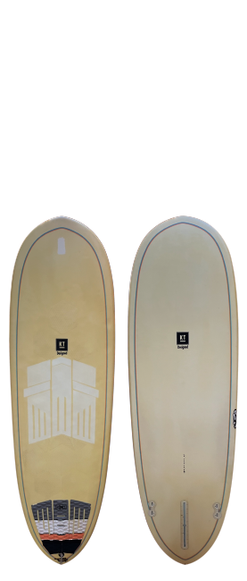 撮影状況でフラッシュや蛍光灯が反射している部分がありますが、実際には色抜けがない、アウトラインの美しいサーフボードです。